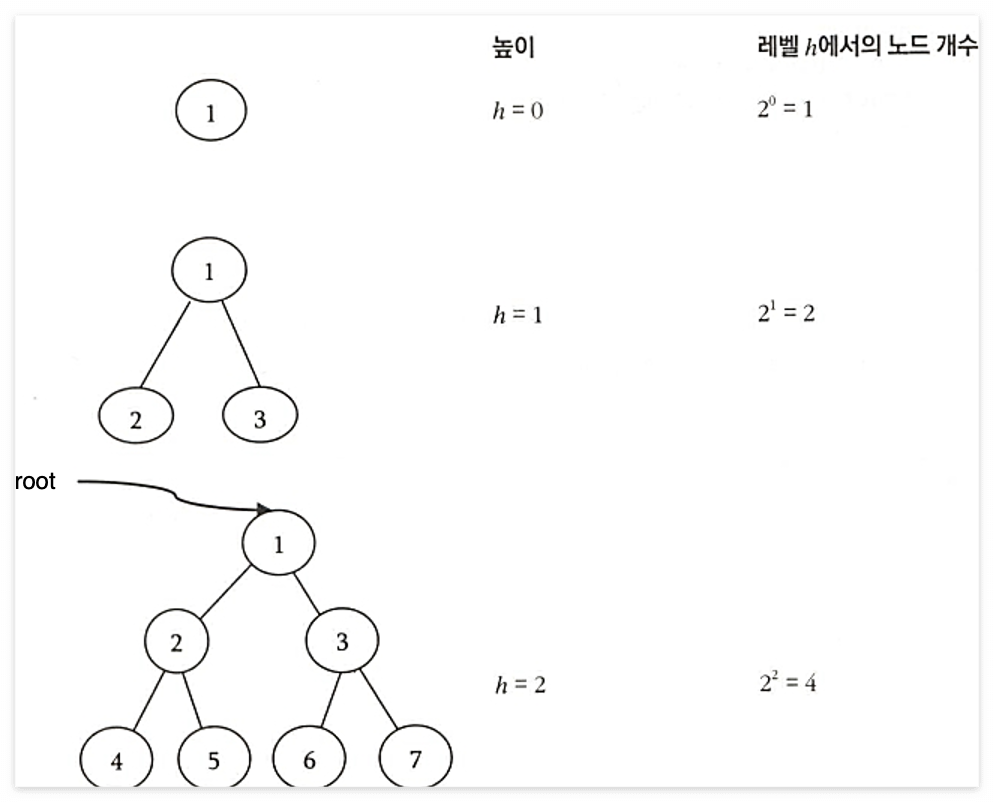 예를 들어, 높이가 h인 Full Binary Tree에서 레벨 h에 있는 노드 수는 2ʰ이다.