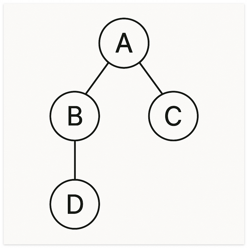 이 트리에서 A는 루트(root)이고, 두 개의 자식 노드인 B와 C를 가지고 있다. B는 왼쪽 자식(D)만 가지고 있고, C는 자식이 없다. 이처럼 왼쪽 서브트리와 오른쪽 서브트리를 각각 독립적으로 가질 수 있다는 유연성이 이진 트리의 핵심이다.